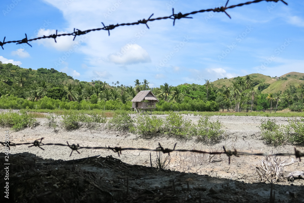 Barbed Wire Fence and Farm Field With Abandoned Hut MIndanao Very well made.